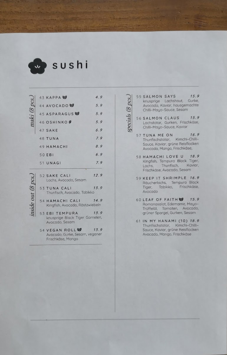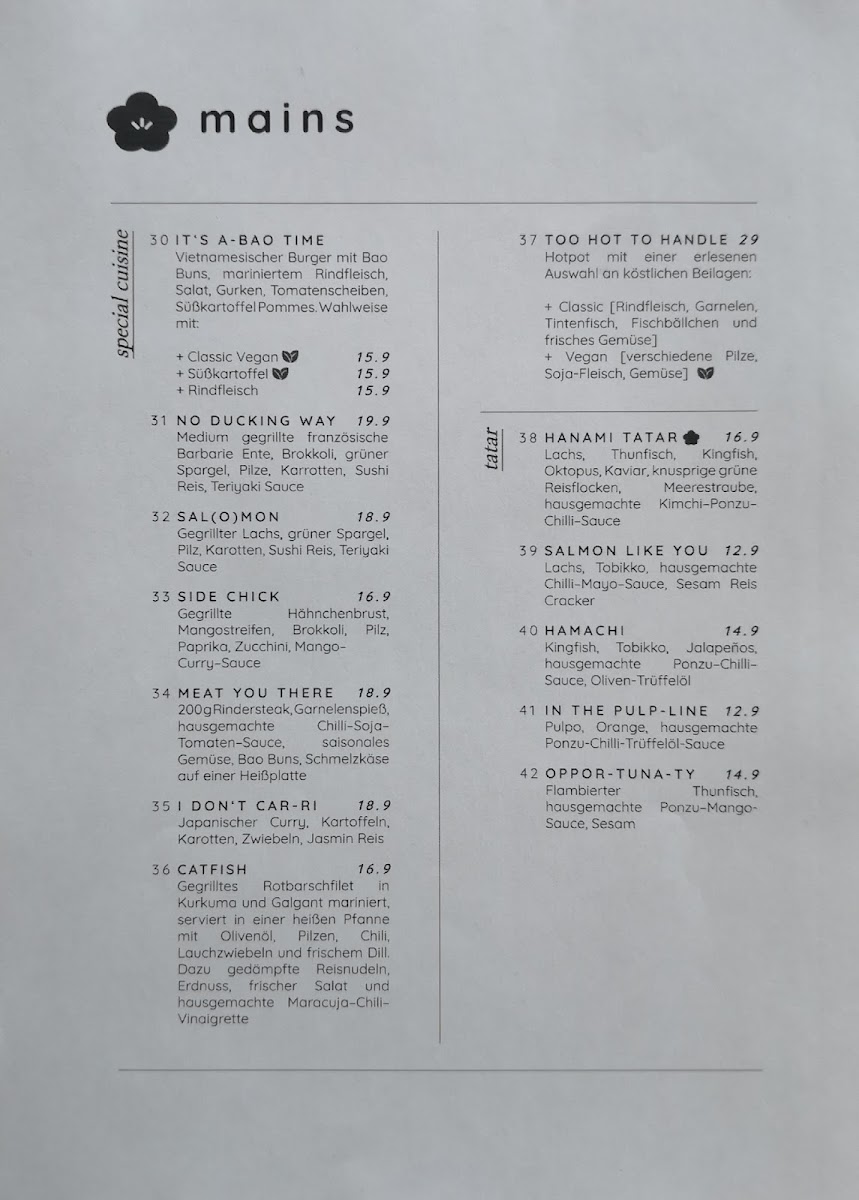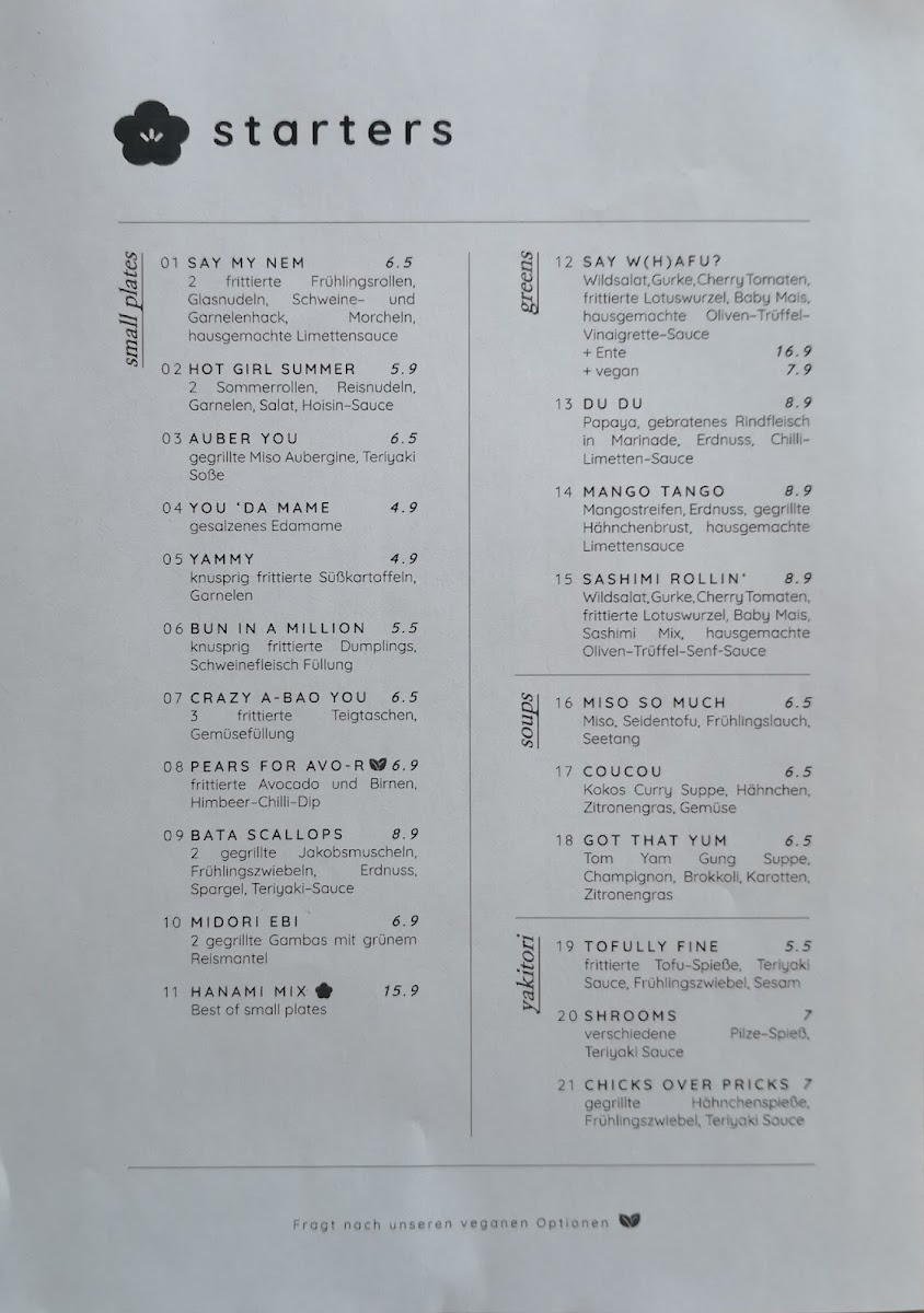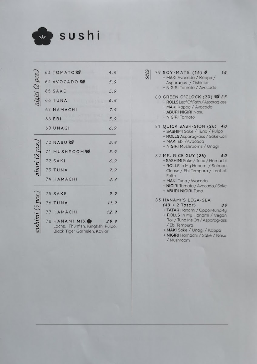 Welcome to Hanami Restaurant Menu, where each dish is crafted to bring you the freshest and most flavorful ingredients straight to your plate. Situated in the heart of Hamburg at Barmbeker Str. 165, this restaurant is a haven for lovers of Japanese cuisine. Whether you're in the mood for delicate sushi, savory ramen, or grilled delicacies, Hanami offers a variety of dishes that cater to every taste. The menu features a perfect balance of traditional recipes and innovative flavors, all prepared with the utmost care and attention to detail. Each bite is a delightful experience, inviting you to savor the authentic taste of Japan right here in Hamburg. With its inviting atmosphere and carefully curated menu, Hanami ensures a memorable dining experience for all its guests.
